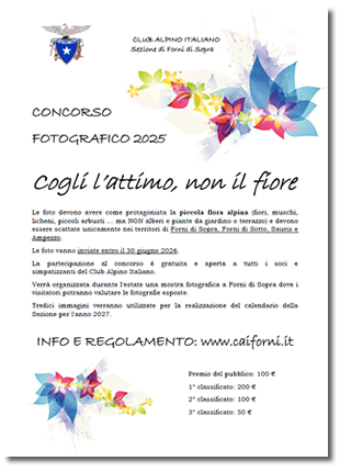 La sezione invita quindi tutti gli interessati ad inviare delle fotografie aventi come tema “Cogli l’attimo, non il fiore”: possono partecipare tutti i soci ed i simpatizzanti del Club Alpino Italiano, compilando il modulo di adesione scaricabile dal sito www.caiforni.it. L’iscrizione è gratuita.